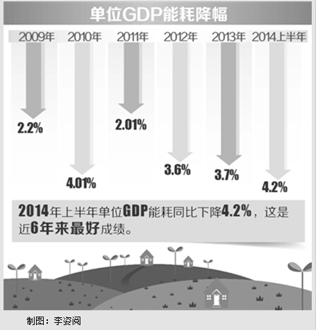 国家统计局数据显示,2009年至2013年,我国单位GDP能耗分别下降了2.2%、4.01%、2.01%、3.6%、3.7%。今年上半年能耗下降幅度为6年来最大。据环保部预测,各项减排工程如期推进,四种主要污染物排放量也持续下降。国家发改委分析认为,结合近期开展的各地节能目标完成情况现场评价考核,参考历史数据,预期可实现全年节能减排目标。