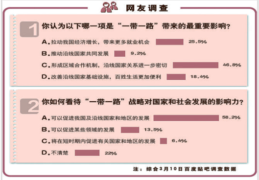 百度贴吧调查显示,58.2%的受访者认为,“一带一路”“可以促进我国及沿线国家和地区的发展”,显示着这样一个战略影响力之强。