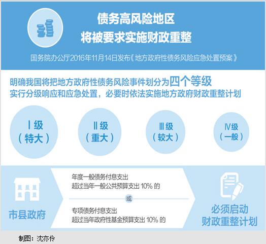 去年,国务院印发了《地方政府性债务风险应急处置预案》,将债务风险事件按照政府性债务风险事件的性质、影响范围和危害程度等情况,划分为Ⅰ级(特大)、Ⅱ级(重大)、Ⅲ级(较大)、Ⅳ级(一般)四个等级。当政府性债务风险事件等级指标有交叉、难以判定级别时,按照较高一级处置,防止风险扩散;当政府性债务风险事件等级随时间推移有所上升时,按照升级后的级别处置。