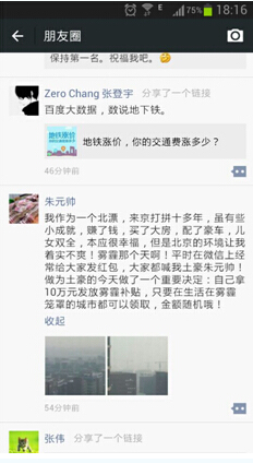 然而微信发出已经5天了,却没有看见任何动静,一些“朱元帅”的微友也表示,这几天一直关注“朱元帅”动向,看他什么时候发钱,然而“朱元帅”就像人间蒸发一样,既没有再发任何说说,也没有与网友互动,更未发过任何“雾霾补贴”。