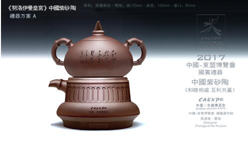 同时霍箭大师还为今年中国东盟博览会主题国——文莱设计了一款国礼《努洛伊曼皇宫》紫砂壶,壶面同样体现了中国传统文化的精髓—书法,张源达在壶面题字为“和谐相处,互利共赢”,寓意中国和文莱和平共处,设计中还特意体现出文莱皇宫的抽象元素。