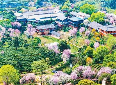 近日,广西壮族自治区梧州市苍梧县六堡镇一茶园春意盎然,紫荆花盛开,与特色民宿、青山相映成景。