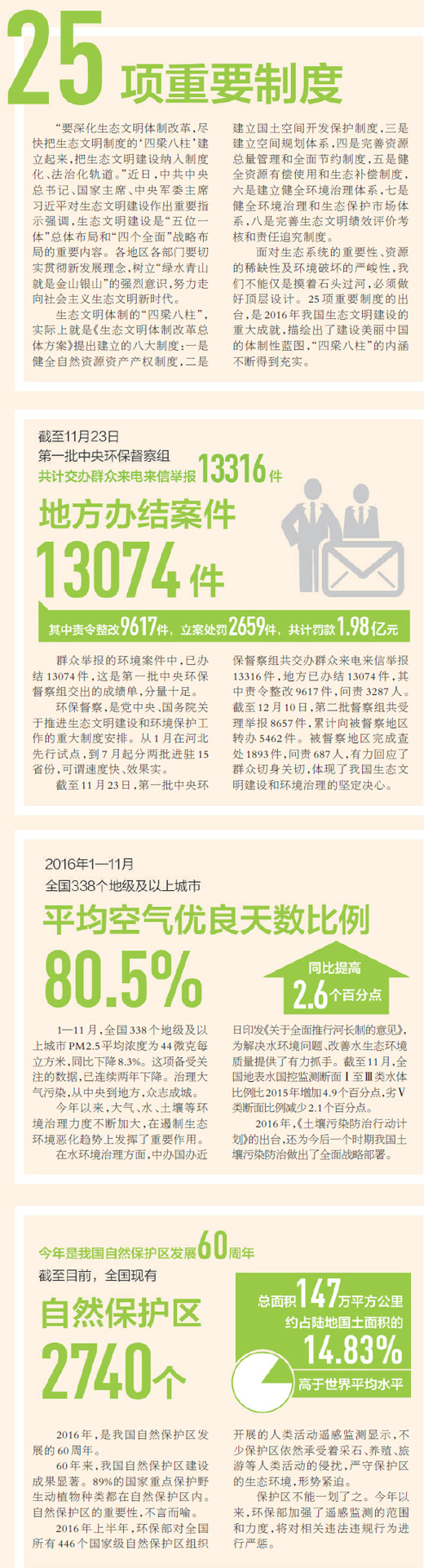 盘点2016年生态环保领域大事,令人振奋。从中央环保督察制度形成到省以下环保机构垂直管理试点,从国家生态文明试验区试点到生态环境损害赔偿制度试点,生态文明制度建设已经按下快进键,改革步伐加快,成果有目共睹。