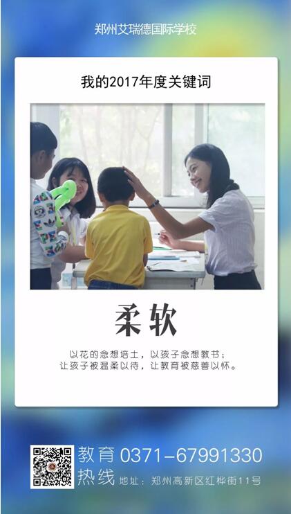 2017年,我们朝夕相处,荣辱与共;我们教学相长,共同进步。高年级的学哥、学姐爱护学弟、学妹,我们爱同学,爱父母,爱老师,爱学校,更爱社会,爱国家,艾瑞德充满了“爱”的温度,用37.2度的爱温暖校园,用真诚的爱感动社会,用无疆的爱连接世界。艾瑞德润物无声地呵护着师生的生命之根,滋养着师生的心灵之花。