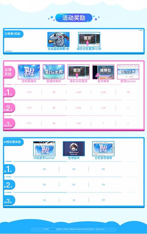 除了以上的榜上奖励,还有M站投票奖励,前三名可以获得M站首页banner天数奖励,官博宣传次数以及分区首页推荐次数。此外还有一个特殊的M站送福利环节,每500票可以获得一个火箭,火箭的限额为30个,发完即止。