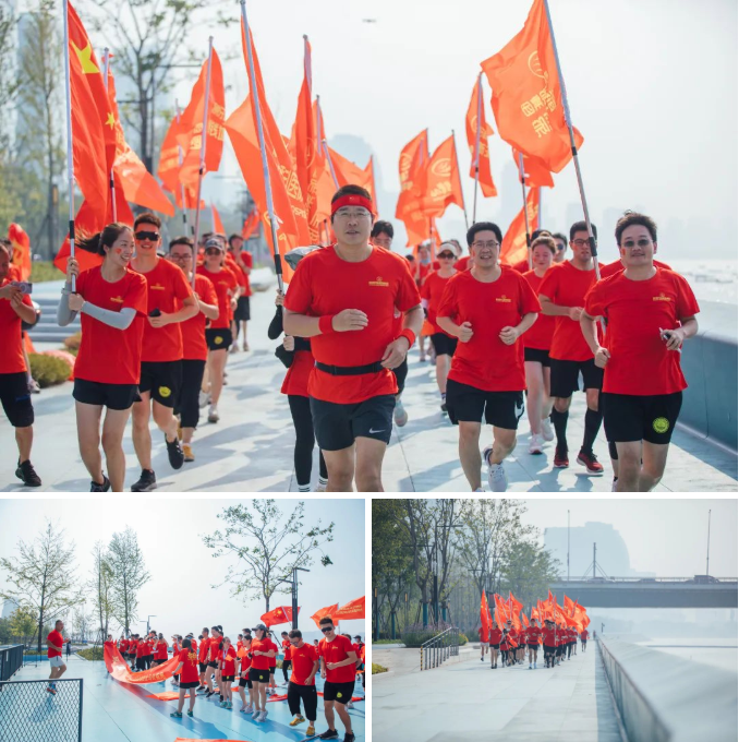 队首国旗招展,又有二十余面杭牙集团院区旗帜随风飘扬~红色热血,渲染时空!