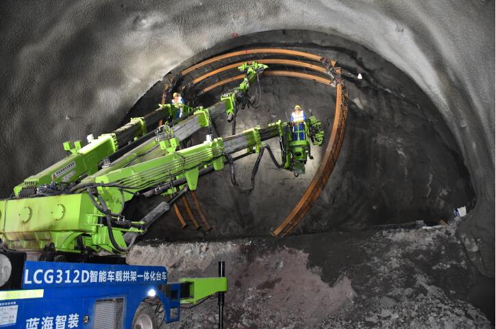 创新技术赋能施工。项目在隧道大机施工过程中,不断尝试、探索,研究,及时成立了科技攻关以及QC活动小组。创新开展拱锚喷一体化台车施作锚杆作业,由于拱架安装后凿岩台车进场施工锚杆会造成时间浪费,降低了整体工效,施工过程中还引进拱锚喷一体化台车施作锚杆的设想并付诸实践,拱锚喷一体化台车可实现拱架安装、锚杆打设和喷射混凝土施工三道工序一台设备施工的目的,大大的缩短了设备重复进出场造成的时间浪费,提高了施工工效,还降低了作业时间。