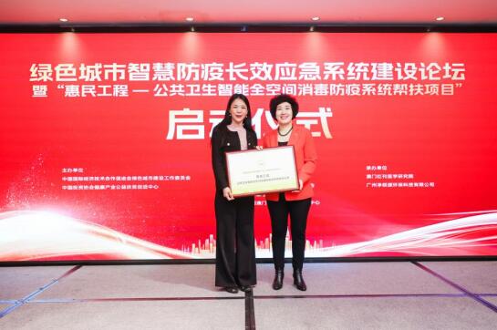 杜芸会长向广州净朗源环保科技有限公司董事长、“惠民工程——公共卫生智能全空间消毒防疫系统帮扶项目”办公室主任陈亭燕授牌