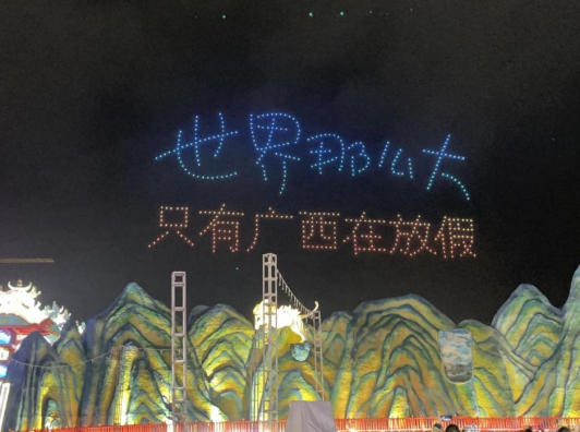 (壮族、瑶族、苗族、侗族、仫佬族、毛南族、回族、京族、彝族、水族、仡佬族共11个世居少数民族,加汉族,一共12个民族身穿各自少数民族服饰,迎接游客到来。)