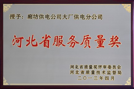 2013年,公司被河北省质量奖评审委员会、河北省质量技术监督局评为2013年度河北省服务质量奖。被县委、县政府授予民族团结进步创先活动先进集体,被团委授予五四红旗团支部,被县妇联授予春蕾助学先进集体,被廊坊供电公司委员会授予文明单位。一个个荣誉的取得为大厂县电力事业大发展迎来了明媚的春天。