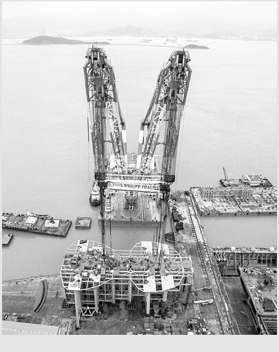 1月12日,装机容量3.4兆瓦的大型海洋潮流能发电机组总成平台在浙江舟山岱山县秀山岛南部海域下海。据介绍,这是我国自主研发生产的装机功率最大的潮流能发电机组。此次下海的3.4兆瓦潮流能发电机组长70米、宽30米,平均高20米,重达2500吨,可抵抗16级台风和4米巨浪,历经6年研发和一年施工完成,拥有完全自主知识产权,并申请了国内外46项核心技术专利。预计6月正式发电,运行稳定后年发电量可达600万千瓦时。图为发电机组的总成平台在码头准备就绪,即将由吊装船吊装下海。