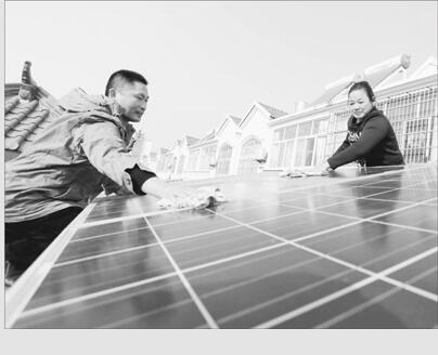 12月15日,江苏省东海县青湖镇青新村的农户在清洗自家太阳能电池板。近年来,该县不断加快能源结构调整力度,大力推进光伏、风能等清洁能源建设,不断延伸清洁能源产业链条;绿色环保的生活方式提升了农民的幸福指数。