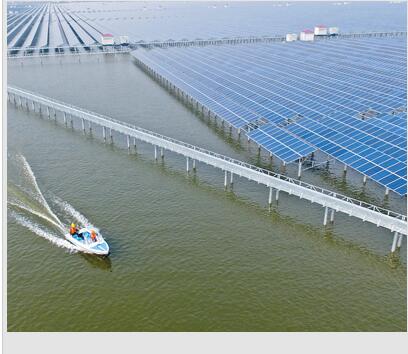 1月11日,在浙江省慈溪市周巷水库和长河水库水面上,全国最大规模“渔光互补”光伏发电项目投运。该项目总投资18亿元,总水域面积4492亩,总装机容量达200兆瓦,预计年均发电量约2.2亿千瓦时。“渔光互补”指渔业养殖与光伏发电相结合,在鱼塘上方架设光伏板阵列,光伏板下方水域养殖鱼虾,形成“上可发电、下可养鱼”的发电新模式。