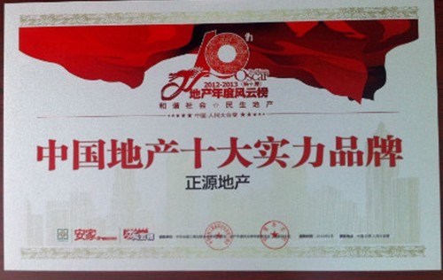 ●2013年1月,正源地产荣获2012-2013(第十届)地产年度风云榜颁发的“中国地产十大实力品牌”奖。