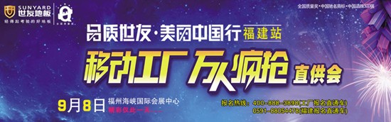 9月8日,世友地板“品质世友、美丽中国行”福建站暨移动工厂万人疯抢直供会大型促销活动将在福州海峡国际会展中心盛大启幕。