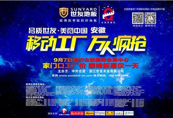 想购买世友地板的消费者朋友,请一定不要错过这次购物良机。9月7日,安徽国际会展中心(2号馆),世友地板与您不见不散。详情请垂询世友地板各专卖店或关注世友地板官方网站及官方微博、微信及时了解动态。