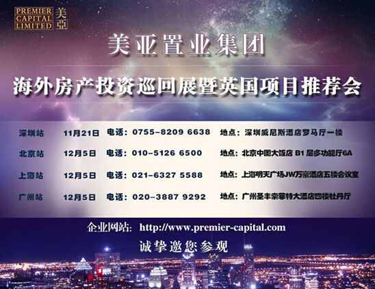 由美亚置业集团主办的“英国投资项目专项巡回展”将于近期在深圳、北京、上海、广州四地陆续拉开帷幕,诸多优质英国投资项目将悉数亮相,其中,备受投资者追捧的伦敦丽晶88(Regent88)服务型写字楼也将强势登陆巡展,届时美亚集团资深投资顾问将为投资者们详细介绍,分析投资亮点及收益回报。