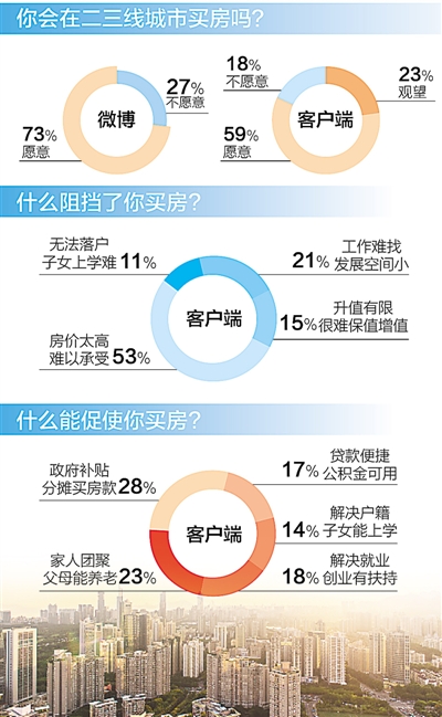 本报北京12月23日电 (记者胡雅婷)近日,本版联合人民日报法人微博、人民日报客户端,发起“你会在二、三线城市买房吗”调查。截至12月23日20点,共有39173人次参与。其中,在微博上,73%的网友表示会在二、三线城市买房;在客户端上,59%的网友表示会在二、三线城市买房,23%的网友表示在观望。