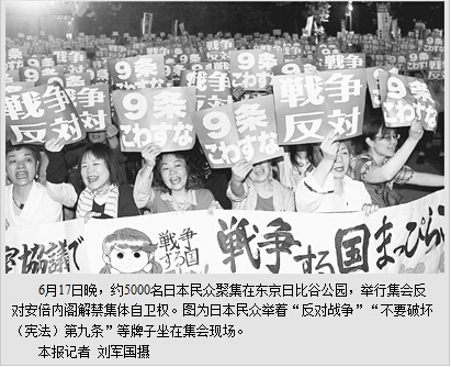 日本民众一直以来通过演讲、集会、游行等活动,表达着“坚决反对安倍内阁解禁集体自卫权使日本可以发动战争”的主张。17日晚,约5000名日本民众聚集在东京日比谷公园,反对安倍解禁集体自卫权。