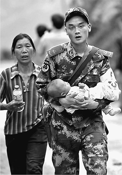 由于车辆不通,很多受重伤的村民只能靠人力抬出,救援人员在争分夺秒。路上还见到很多解放军战士扛着帐篷通过。