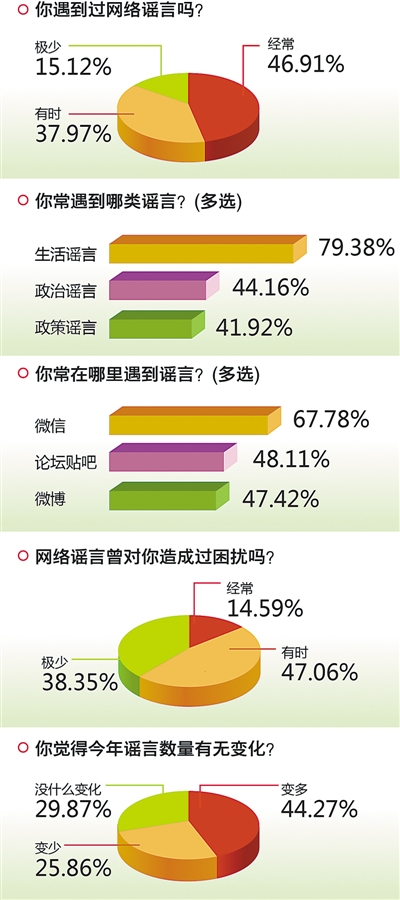 12月初,“求证”栏目联合人民网强国论坛、人民日报媒体技术公司向广大网友发布问卷调查。结果显示44.27%的网友感觉今年的谣言变多了。