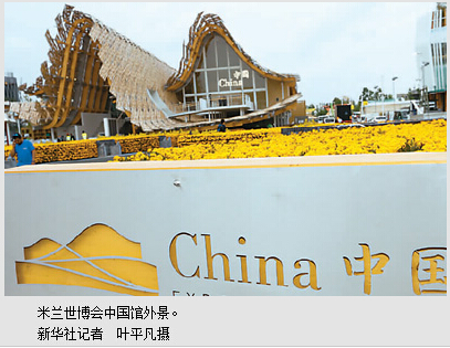 本次世博会中国馆的主题为“希望的田野,生命的源泉”。历时两年多设计、近一年建造,中国馆以创新的设计、深厚的内涵、抒情的叙事和现代的设计语言诠释中国文化,其中亮点颇多。整个建筑外观形似“麦浪”,吸收中国传统歇山式元素,契合本届世博会农业和粮食的主题,建筑屋顶采用具有中国特色的竹瓦材料。整个中国馆分“序、天、地、人、和”五大展区,其中,“地”展区中的“回望田野”由2万根顶部为LED发光体的人工“麦穗”组成,构成巨大的具有立体感的动态田野画面,视觉冲击强烈。