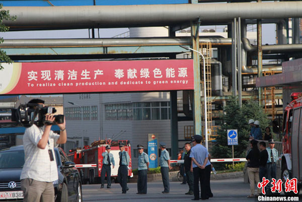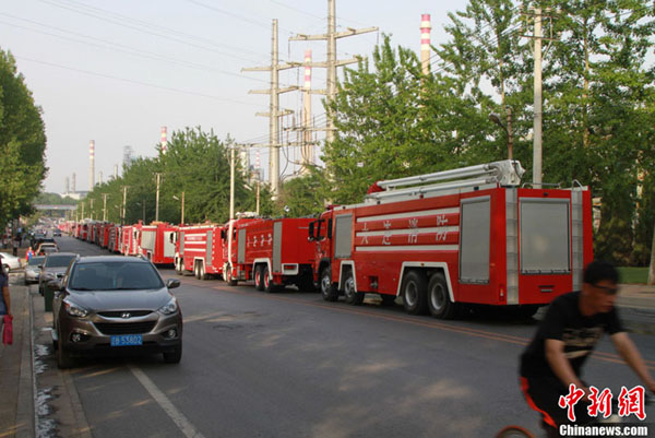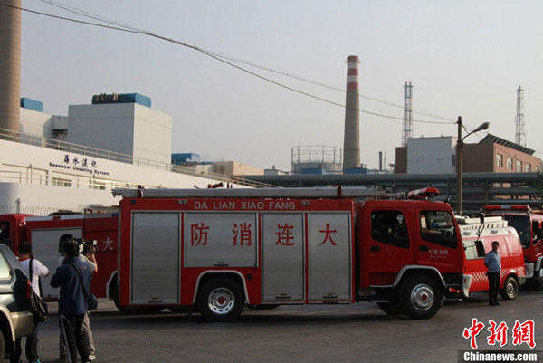 图为大连石化公司外,数十辆消防车聚集。中新社发 宫旭 摄