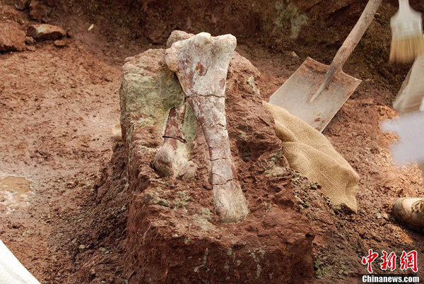 中国科学院古脊椎动物与古人类研究所科考人员日前在“中国恐龙之乡”山东莱阳一处距今约8000万年的白垩纪恐龙化石层,现场发掘、清理出大量恐龙化石,并用石膏等包裹制成标本。这些取出的恐龙骨骼化石除了科学研究外,还将成为恐龙化石装架材料,为建成莱阳“白垩纪国家级地质公园”做准备。莱阳具有丰富的恐龙化石、恐龙蛋化石和恐龙足迹化石,目前共发现和命名的恐龙达8属11种,恐龙蛋化石5属11种。