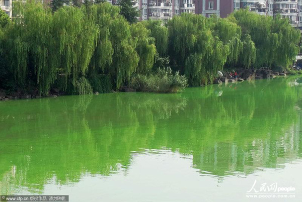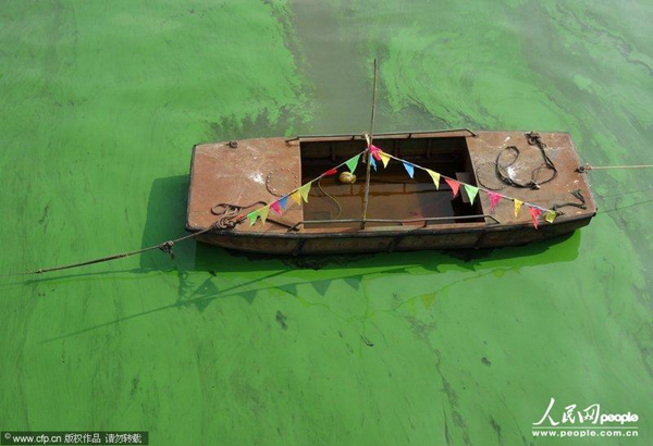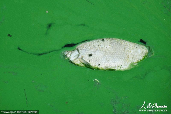 2013年09月14日,江苏省无锡市,城区河道蓝藻持续泛滥。立秋以来,受持续高温和闷热天气影响,江苏省无锡市城区梁溪河道内蓝藻持续泛滥,沿岸河面漂浮着发臭的死鱼依稀可见。水戈/CFP