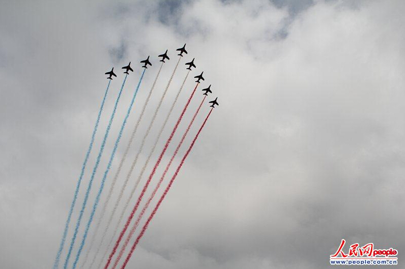 飞机拖着红白蓝三色彩烟掠过香榭丽舍大街上空。人民网记者李...