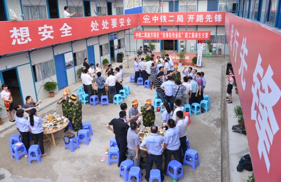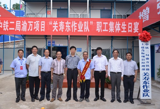 5月28日下午,中铁二局渝万铁路项目经理部渝万全线最长的隧道——分水镇隧道(全长9167米)斜井工点,在以全国五.一劳动奖章获得者关寿东个人名字命名的一个集体——“关寿东作业队“驻地举行了一场别开生面的职(民)工集体生日宴,为在本月内2名职工和4名农民工过生日的他们庆祝。渝万公司董事长、总经理、党委书记王明慧、重庆市总工会党组成员、副主席鞠飞、重庆市万州区总工会主席陈保余、集团公司党委书记、股份公司总经理邓元发,集团公司党委常委、工会主席张文杰,二公司董事长、总经理董宁,党委书记刘洪以及六公司、新运公司、物资公司等党政领导出席了筵会并与职工和农民工兄弟举杯欢庆。生日宴由集团公司工会副主席彭英主持,集团公司工会主席张文杰在生日宴上发表了热情洋溢的致辞。