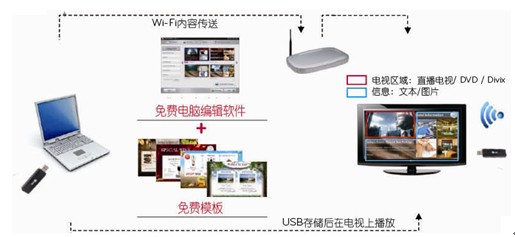 LN549E无需任何其他硬件设备,便可直接借助U盘输出或无线传输的形式,将事先编辑好的画面或图像传输到TV,实现画面的同步播放,为企业最大限度地节省设备的成本投入。