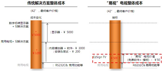 “易视”电视数字标牌具有可观的成本优势。凭借着电视与数字标牌的合二为一以及多元快捷的应用方式,大大节省了购买机器设备以及安装、调试软件的费用。以42寸最终客户价格为例,传统的解决方案的整体成本要比“易视”电视高出154%,大大的节约了成本,为客户,特别是中小企业主提供了最具性价比的数字标牌解决方案。