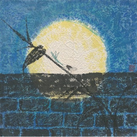 这幅《月下悄悄话》,是罗小华精心之作。在色彩和选题上,都暗藏着浓浓的法式情结。整幅布局别致,简洁明了的突出主题。月夜的静谧由冷色调的画面表现出来,但在主色的选择上,作画者选取了如大海一般的蓝色,使夜空通透、轻盈,虽在夜晚,但月光依然照亮了夜空。在法国,蓝色是人们最爱的颜色之一,蓝色是法国国旗上的的一抹色彩,蓝色也象征着抽象画派的超然另类的自由想象。在法国艺术家眼中,光蓝色这一种色彩就分类成十几种,法国人把国旗上的蓝色定义成“比天蓝要深一点,但又比海蓝浅一点的独特颜色”。在罗小华这幅《月下悄悄话》中,蓝色也同样象征着静谧与自由。是自然中最和谐的一种色彩。