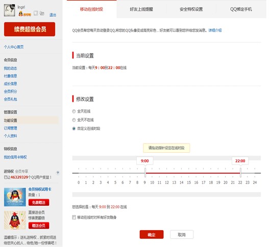 进入QQ会员专区,然后点击页面右上角的“个人中心”,在个人中心页面左侧栏找到“功能设置”,这样就能看到移动在线时段设置了。