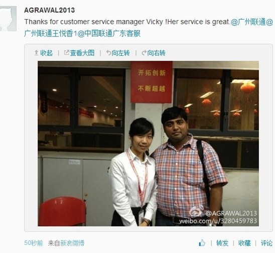 据Agrawal介绍,有一次他出差到美国,由于忘了及时缴费,手机停了打不出电话,但这厢已经约了客户洽谈,万一客户致电找不到自己,这次的损失将是近100万的订单,关键时刻,他想起了时常给他发问候短信的联通服务经理Vicky,通过免费国际服务热线,他成功联系上了Vicky,当时中国时间已是凌晨1点多,他觉得很不好意思,但Vicky二话不说,便帮他办理了紧急开机,他非常感动。还有一次,他手机被盗了,急得像锅上的蚂蚁,但自己正在参加广交会,无法去营业厅办理购机、补卡等,于是他再次向服务经理求助,Vicky很替他着急,利用午饭时间帮他到营业厅办理了相关手续,并通过转账重购了一台iphone,亲自来到琶洲展馆,交到了Agrawal手上,他很感激,说“Luckily I chose China Unicom, met a customer service manager who has high sense of responsibility.”(很幸运我选择了联通,遇到了一位如此有责任感的服务经理)。