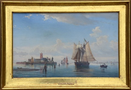《威尼斯环礁湖》是丹麦海洋艺术家威艾姆•麦尔贝Vilhelm MELBYE的作品。他绘画的作品展现了海景,海岸,海港景色,帆船,以及欧洲很多地方的地形主题,尤其是在地中海。麦尔贝更倾向的是一种现实主义的风格,通常作品中都带有浪漫或是戏剧性的场景。