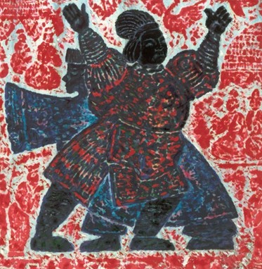 对敦煌壁画的研究经历,赋予了罗小华深厚的中国文化底蕴,而《武术》这幅作品的主题以及绘画手法也来源于中国传统文化之中。受到敦煌壁画风格的影响,整幅作品的格局类似敦煌壁画,而对人物细节的刻画可谓是这幅作品的出彩之处。处于画面前方的人做“大鹏展翅”状,身后的人做推送状,这两个姿势都是来源于古代武术中的两个主要动作,观者第一眼看到后就能产生共鸣,同时产生观赏的兴趣。再看画中人物的服饰,前者的身着藤甲,头饰也和汉朝的士兵比较类似,整体服装和兵马俑以为像似。而后者的衣着则类似文官服饰。罗小华通过服饰的刻画,来展现出武术是全民共享的运动,适于社会各阶层的人。再看这幅作品的绘画手法,貌似版画式的手法,带个观者强烈的中国风特色,印章一般的画面,让人物充满了质感和历史感,红色的背景也辅以中华民族的特色。人物的用色也会造成错觉,仿佛在观看某个古代青铜器上的雕刻,充满意味深长的历史情怀。罗小华用《武术》一作全面展现出对中华文化的深刻理解和热情。