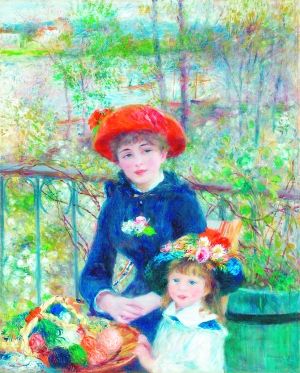 雷诺阿是一位颇受大众青睐的画家,专以人物画出名。他对色彩运用娴熟得当,以刻画清新明快的人物和渲染甜美悠闲的氛围著称。在绘画技法上,雷诺阿改用补色的方式取代了以黑色画阴影的习惯,这对印象派以及之后的新印象派点描画法,具有很大贡献。《两姐妹》是雷诺阿绘于1881年的作品。画中的姐姐正值韶华,明眸善睐,娴静优雅,身着一袭素净的藏蓝色连衣裙,头戴一顶鲜红色遮阳帽,胸前佩着一簇小花,两手合拢轻搭在腿上,含胸而坐若有所思地遥望左侧。一旁的妹妹是黄发垂髫,天真烂漫的孩童模样,红扑扑的脸颊,宝石蓝的眼睛,一身雪白裙装,藏蓝色帽檐插满了娇艳欲滴的鲜花,双手扶着茶几上的篮筐,身靠着姐姐,似乎正入神地看一只小狗在眼前调皮。姊妹俩一长一幼,一坐一立,眼神各望一方,洋溢着清新纯真。雷诺阿爱画人,他光影交错的“彩虹色系”,以最柔软的方式轻触心灵,教人心生出家庭式的温馨感。