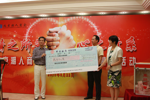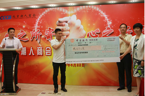 图:“情之所寄 心之所系”募捐活动上国瑞集团北京公司李斌总经理代表北京潮人商会会长张章笋捐赠200万
