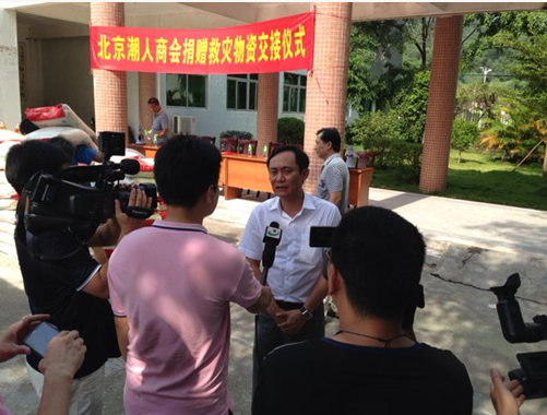 图:北京潮人商会常务副会长林辉勇在救灾物资发放现场接受媒体采访