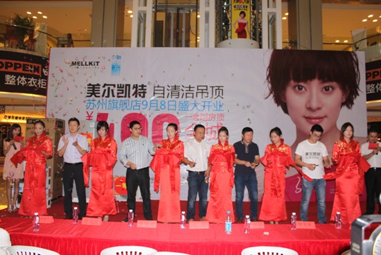 2013年夏,美尔凯特自清洁吊顶——苏州四代形象旗舰店落成,店面恢弘精致,开放式门脸设计和交互式用户体验让此终端店面在商场中卓然出众,成为2013年美尔凯特终端之翘楚。该店位于苏州新区红星美凯龙负一楼,是目前苏州人气最旺,档次最高的品牌家居卖场。优势的市场载体,良好的运营平台,精美的店面设计为店面经营奠定基础。