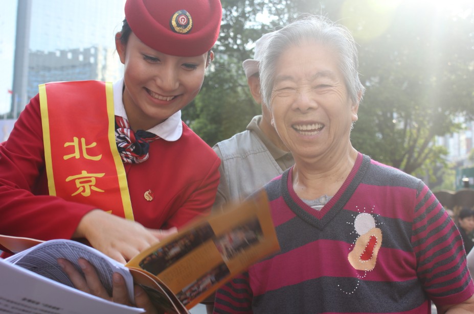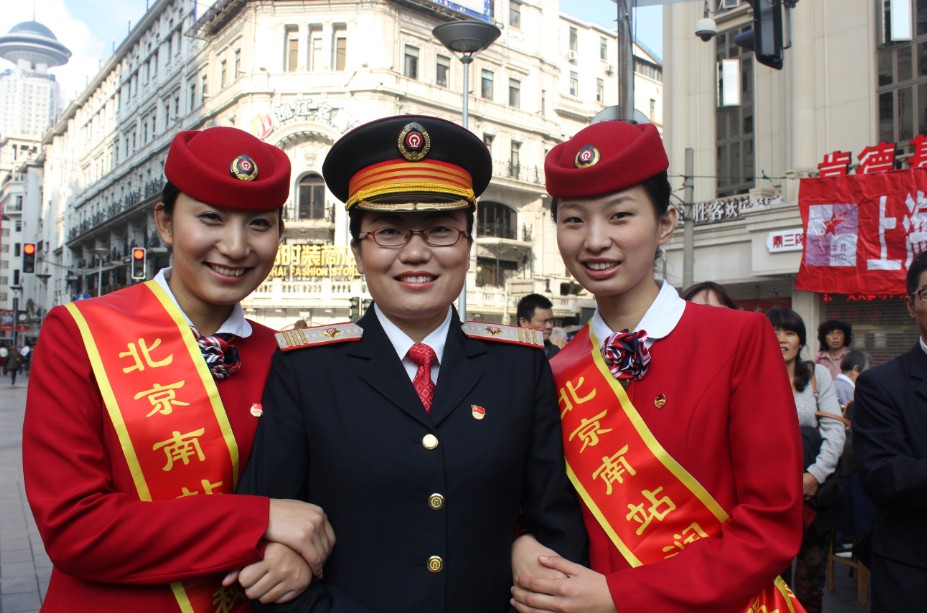 北京南站润秋服务组成员邢艺冰在上海南京路为人民服务现场向外地游客宣传北京南站爱心服务法