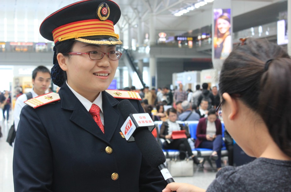 全国劳模张润秋在上海虹桥站接受媒体采访