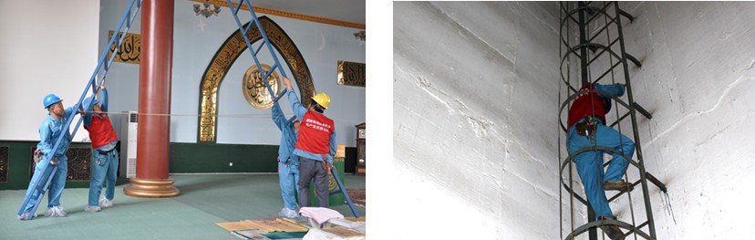 由于天气炎热,加之清真寺内建筑一般较高,给检修工作带来很多不便之处。王班长带领着城区班,在3米多高的人字梯上认真查找线路设备故障点,确保彻底排除线路设备故障。由于清真寺望月亭上的照射灯使用时间较长,技术落后,影响了宗教活动的开展,急需维修。为此,王班长决定安装新型LED照射灯。清真寺的望月亭是寺内最高建筑,需要从专门的垂直铁梯通道上下,给检修工作带来很多不便之处。但王班长不顾近50岁的年龄和常年一线工作积累的慢性伤痛,在20米多高的铁梯上爬上爬下,认真查找线路设备故障点,确保彻底排除线路设备故障,在比5层楼还高的狭窄的望月亭平台上安装好新型照射灯,并一次试开成功,对两个望月亭垂直通道内外的近百米线路进行了检修和部分更换,为清真寺更好的服务回族同胞作出了自己的贡献,再一次唱响了伊乡小镇民族团结、和谐的主旋律。