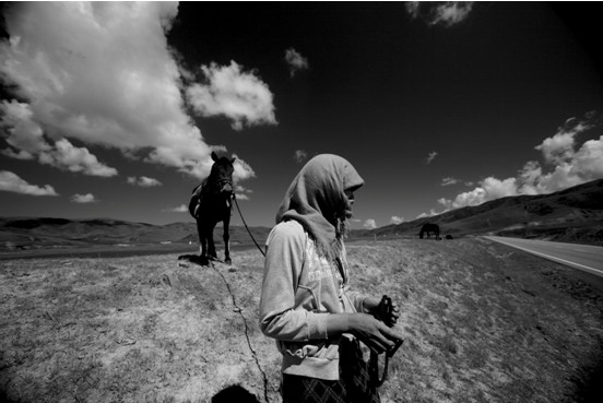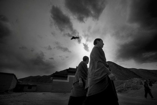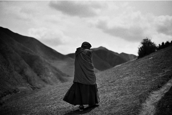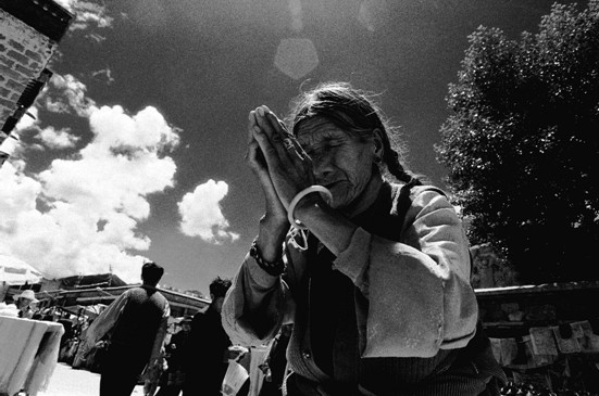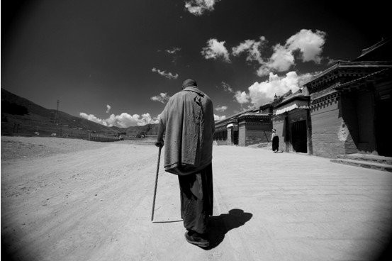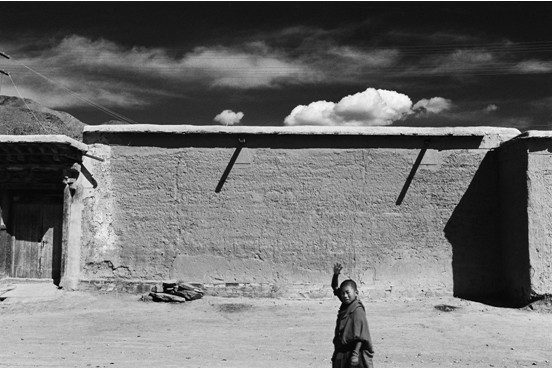 施政的西藏照片里,体现最多的就是一个字,“远”。不仅仅是空间感上的“远”,因为空间上的远,西藏保留了很多老的东西,这就让他感受到时间上的“远”,给他一种不同的感觉。施政就是到那里去寻找能够对应自己的东西。去也不做功课,兜到哪里算哪里。喜欢道听途说,“小道消息”对他来说是主要信息来源,路人甲跟他说:“那边很灵的”,他就去了。比如第一次去藏区,就全无所知,在火车上到处问,哪里好玩?还有一个更简单的方法,看地图,看地图上的字,比如“夏河”“卓妮”,“看哪个地名最能引起我想去的欲望,哪个名字特别有藏族的味道。”而后来,每一次去西藏都像第一次去,充满了兴奋、激动,没什么因为很熟悉了就疲掉了。