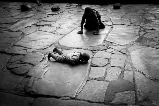 施政最喜欢拿来说事儿的一张照片是他用16毫米广角镜和胶片拍的,边框还隐约在,没裁割过。照片里一位母亲正面对着镜头,孩子凑在她胸前吃奶,虽然袒胸露乳,而且据施政说,其实他离她不过一臂距离,但这位母亲没有不安也没有惊恐,她是看着镜头的,但就好像镜头是不存在的。怎么做到的?施政说,拍照片就要放弃自己的目的。在拍摄之前,施政已经跟这一家人相处了大半天。“我就是跑得累了,坐在那里休息,他们一家人也在休息,我就和小孩子玩。不远处有小卖部,坐得久,饿了,就喊小孩子过来,‘去帮我到小卖部买饼干’,买来跟他们分着吃,渴了去买几瓶水,和他们分着喝,这样大半天下来,人家对我真的一点戒心也没有了。这是一个玩的过程,起初的目的并不是拍照。拍照片是一个交流的过程,只想到你要拍的内容,这是不对的。”