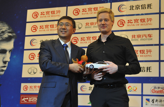 2014年3月30日下午3点,2014世界斯诺克中国公开赛在北京红杉假日酒店举行了新闻发布会,国家体育总局小球运动管理中心副主任王延梅、世界台球联合会主席杰森•弗格森出席发布会。斯诺克中国赛白金赞助商北京汽车销售有限公司党委副书记赵锦伦向上届冠军尼尔•罗宾逊赠送绅宝车模。上届单杆最高分选手马克•塞尔比、2012年总冠军彼得•艾伯顿也来到现场,与记者互动。