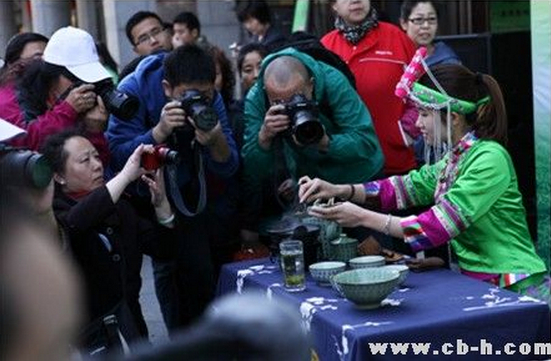 来自张一元浙江景宁绿色生产基地的高级茶艺师,是畲族少数民族,她们独特的泡茶方法和别具特色的茶服,令在场观众耳目一新。