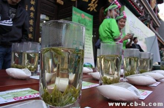 来自张一元四川峨眉山绿色生产基地的高级茶艺师,现场展示明前绿茶“仙芝竹尖”,冲泡后颗颗茶芽竖立悬于杯中